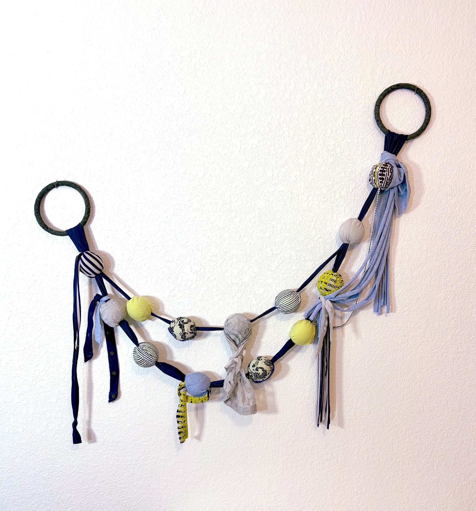 Tennis has been a part of my life for the past decade, and there's a moment at the beginning of every match when the words "Love-All" are uttered, signifying a zero-zero start. At this point in time, everything is ahead of you, and it feels like all things are possible. With that sentiment in mind, and taking discarded items at the "end" of their life cycle, I flip the script to give them a fresh start. Titles convey lessons that apply to both tennis and life. These wall hangings have a bohemian vibe, with frayed edges, layered fabrics and spirited movement.