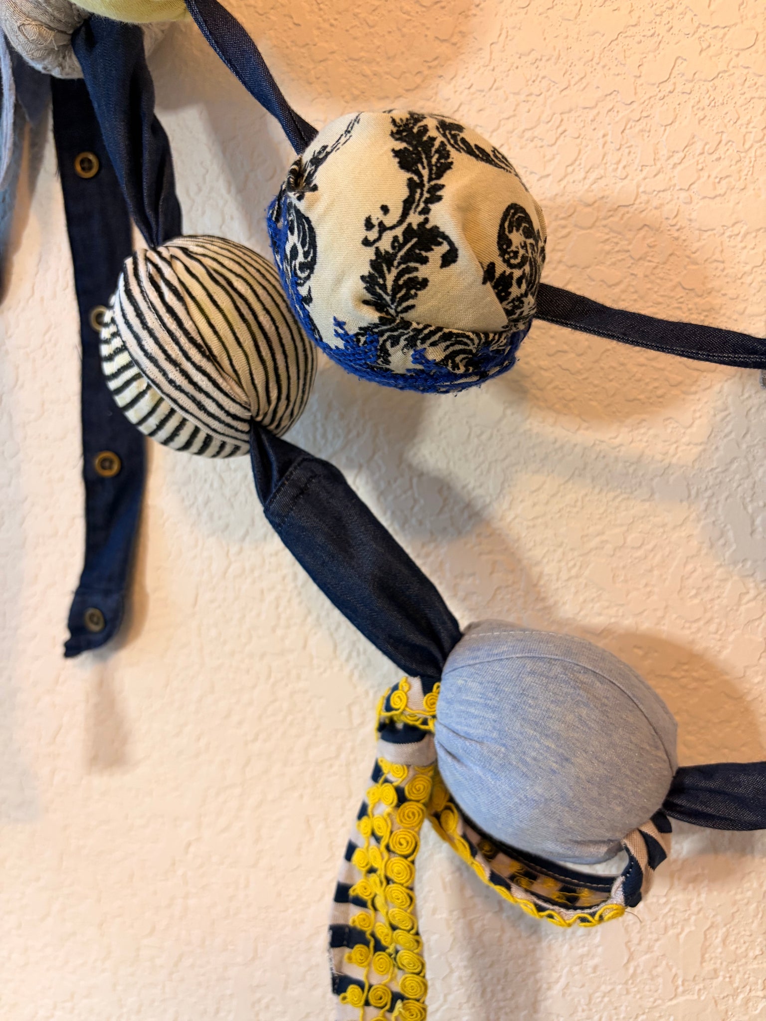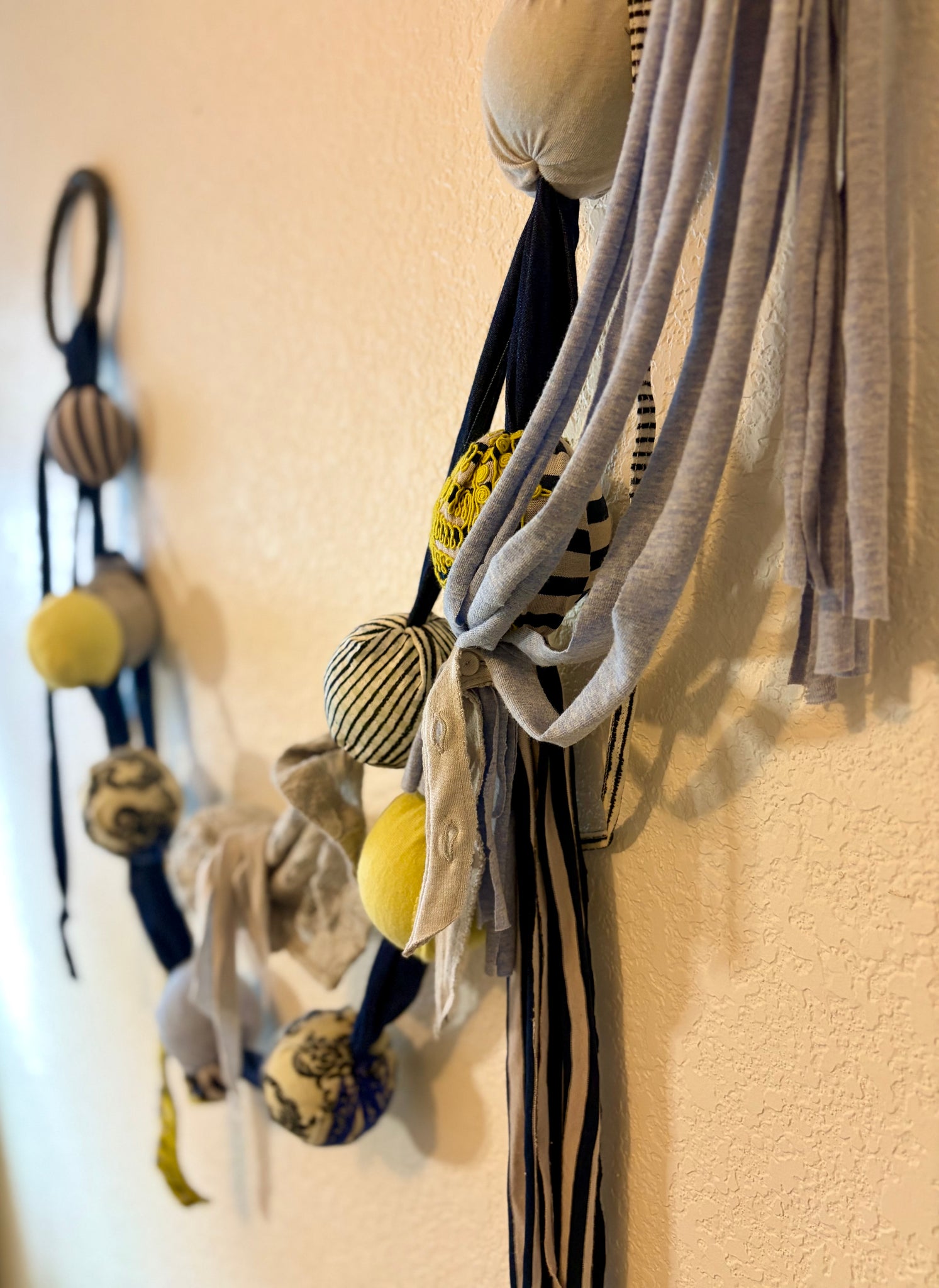 This wall hanging is part of the "Love-All" textile Collection, constructed from upcycled tennis balls, clothing, tennis grips and shoelaces. Currently on exhibit at the new RacFit Tennis Facility (1390 Robert S. Light Blvd, Buda, TX).